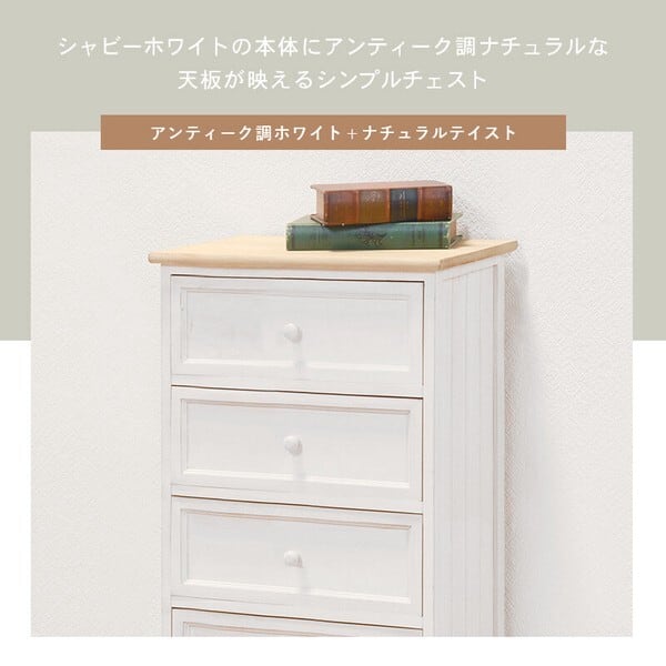 シャビーホワイトの本体にアンティーク調ナチュラルな天板が映える、シンプルチェスト。