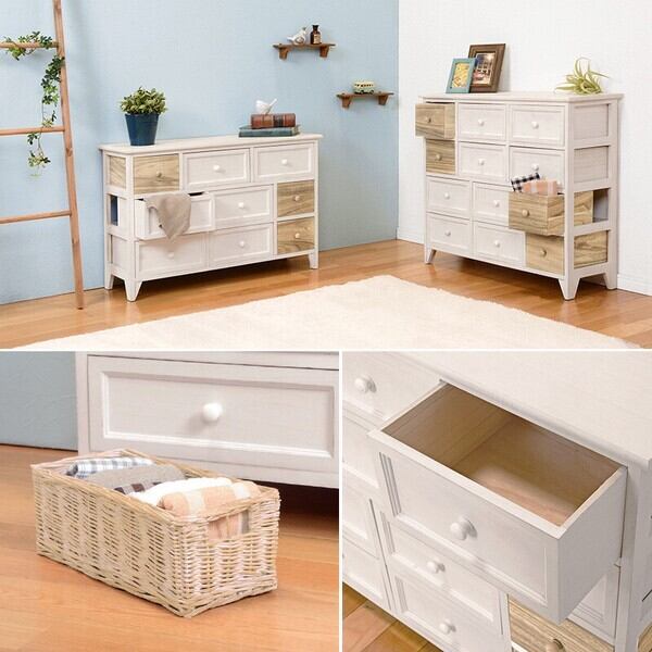 たっぷり収納できる、シンプルなアンティーク調チェスト。柳のカゴがアクセント。