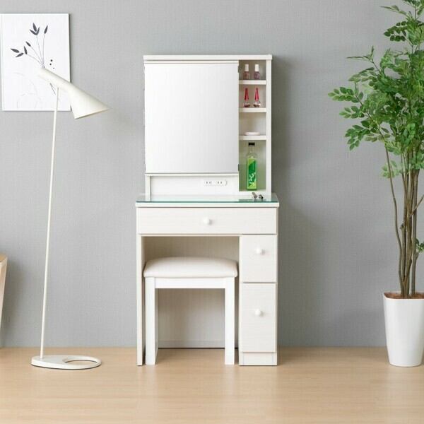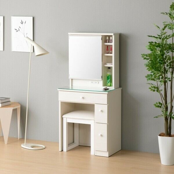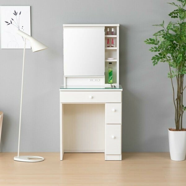広々とした天板は、メイク道具や小物をしっかり収納できるので、日々の準備がスムーズに行えます。また、こだわりの引き出しには、使用頻度の高いアイテムを整理して収納しておけるスペースが確保されています。