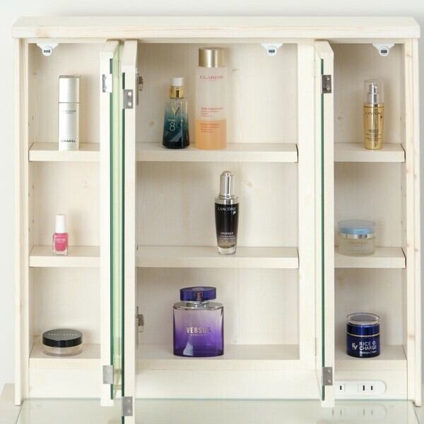 木目を活かしたお洒落な三面鏡ドレッサー。合わせ鏡にも使える三面鏡の裏側には、可動棚付きのたっぷり収納スペース。鏡裏収納の右下には、便利な2口コンセント付き。右下の引き出しは、ボトル類などの背の高いものを収納可能。フルスライドレールなので出し入れラクラクです。