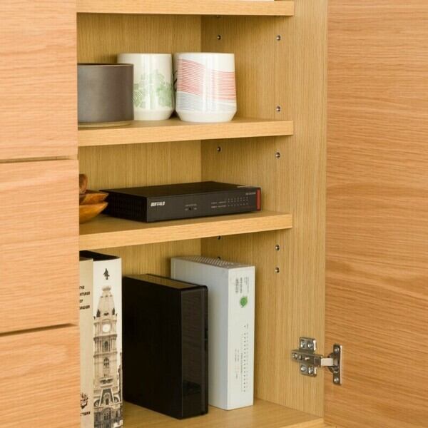 背面にコード通しがあり、電話の親機などもすっきり収納。足元スペースにはルンバも入ります。シンプルなデザインでお部屋スッキリ